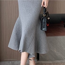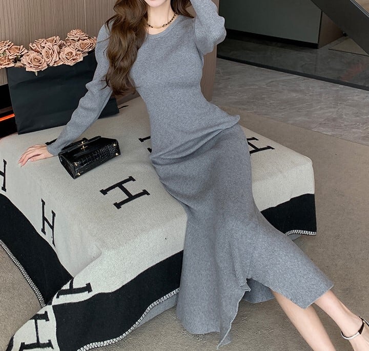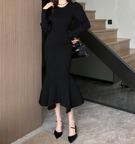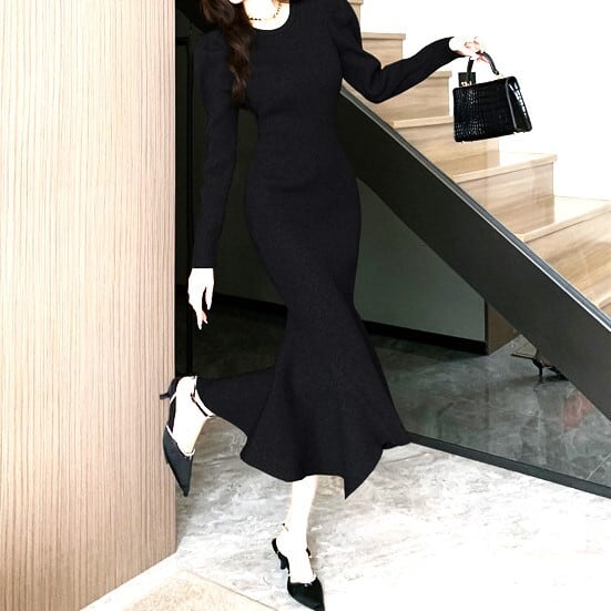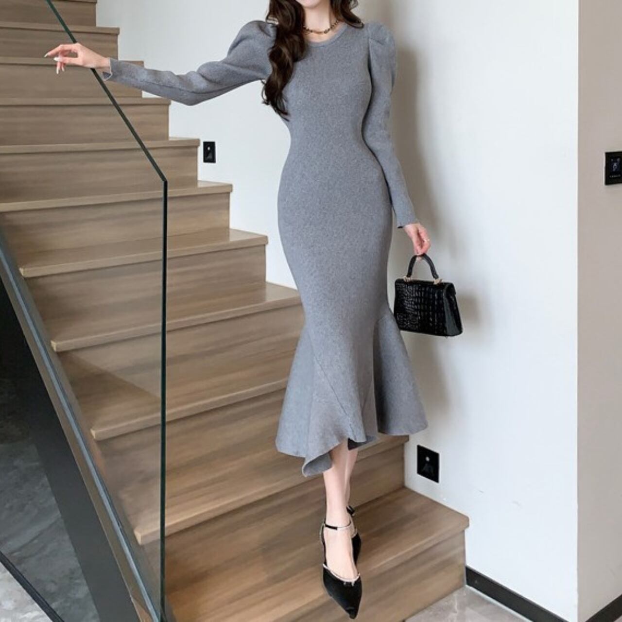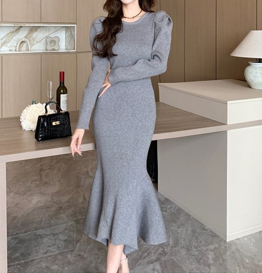 着用するだけでフェミニンな雰囲気が漂うパフスリーブエレガントロングニットマーメイドドレス。