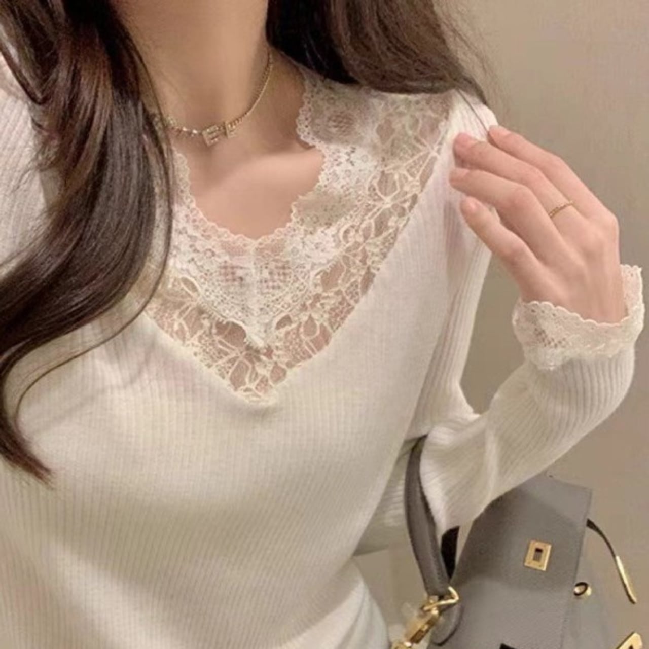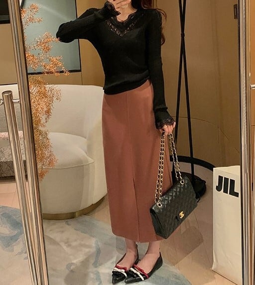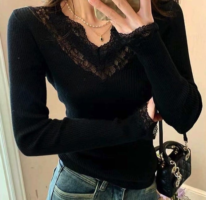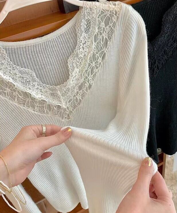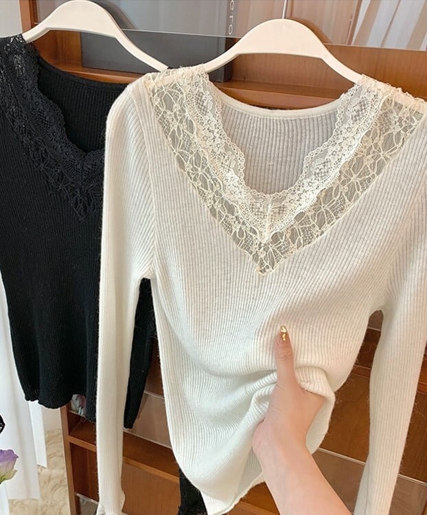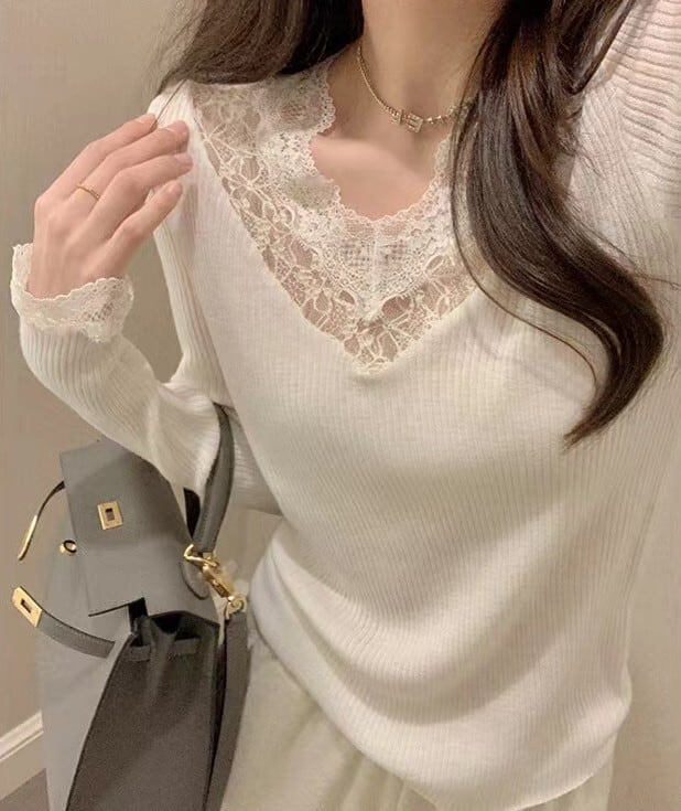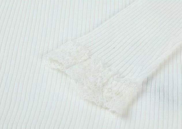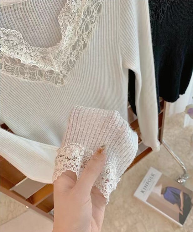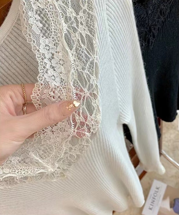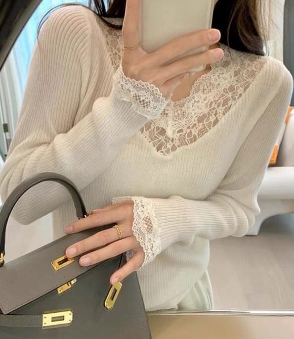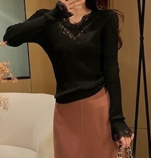 着用するだけでフェミニンな雰囲気が漂うレースステッチエレガントスリムニット。