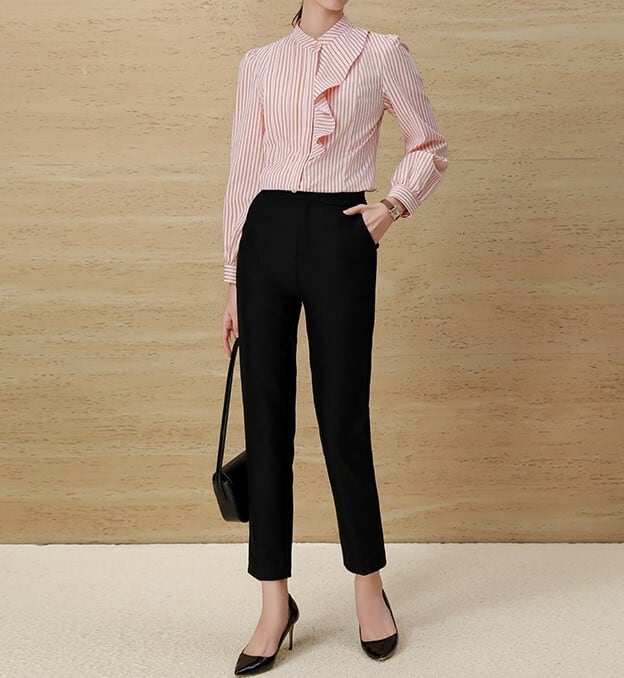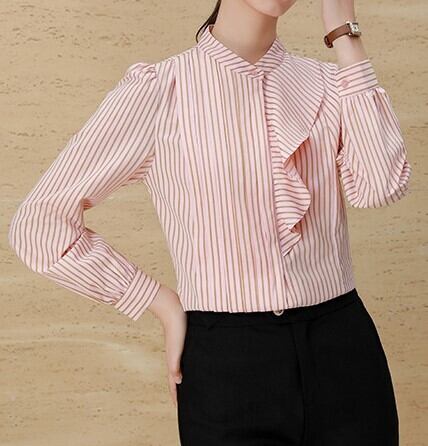 Collarless elegant chest ruffle stripe shirt ( 2color )