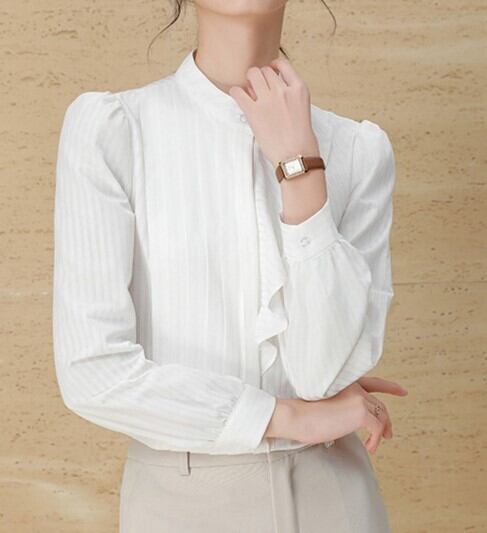 着用するだけで上品で大人可愛い雰囲気が漂うカラーレスエレガントチェストラッフルストライプシャツ。