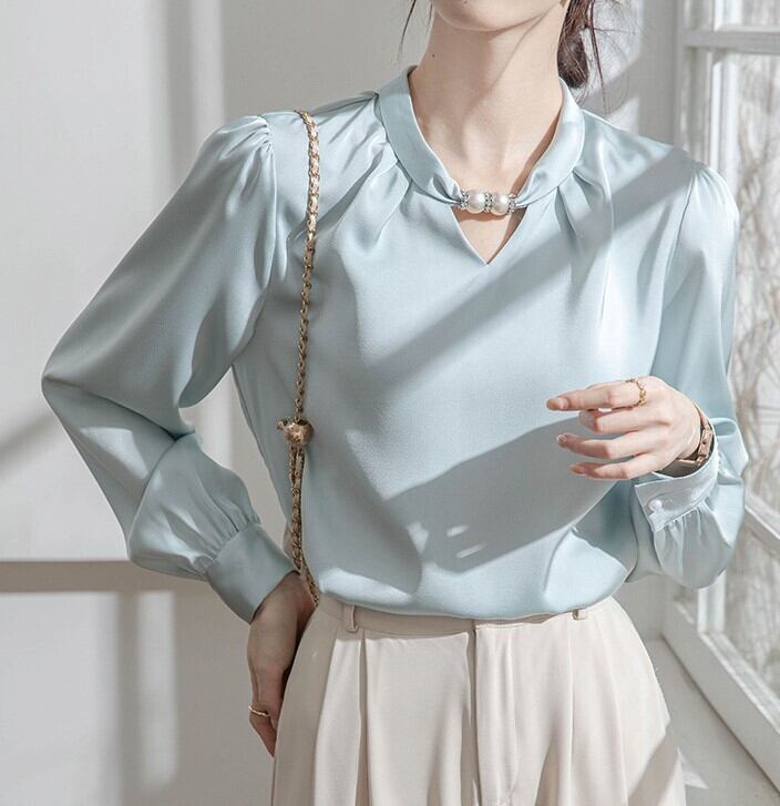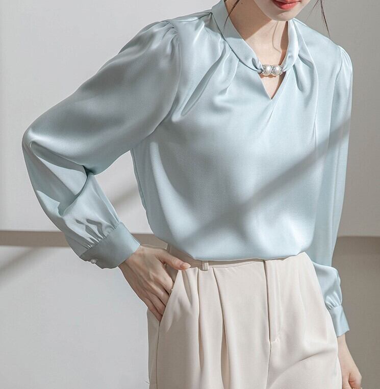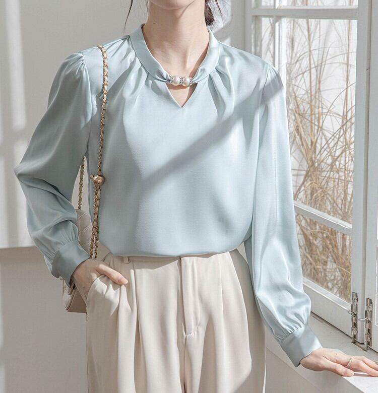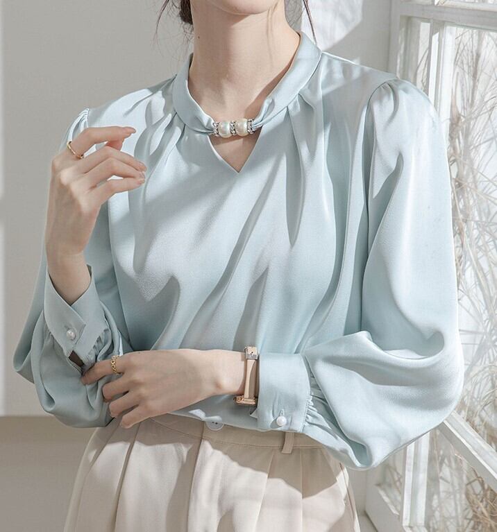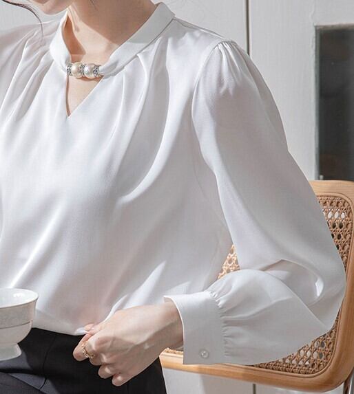 着用するだけで上品さと大人可愛さが漂うカラーレスエレガントチェストビーズシャツ。