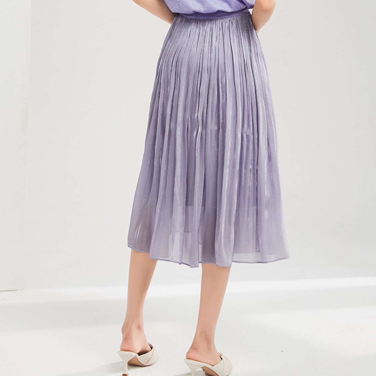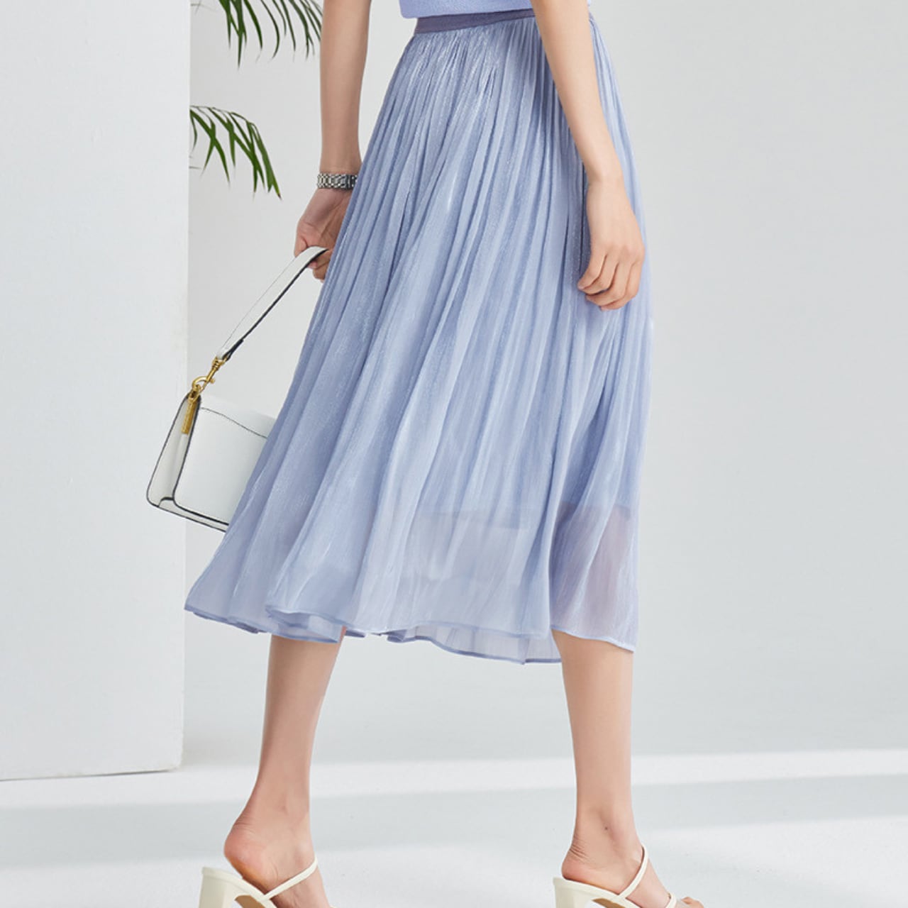 光沢のあるフェミニンな印象のハイウエストエレガントメッシュスウィングスカート。