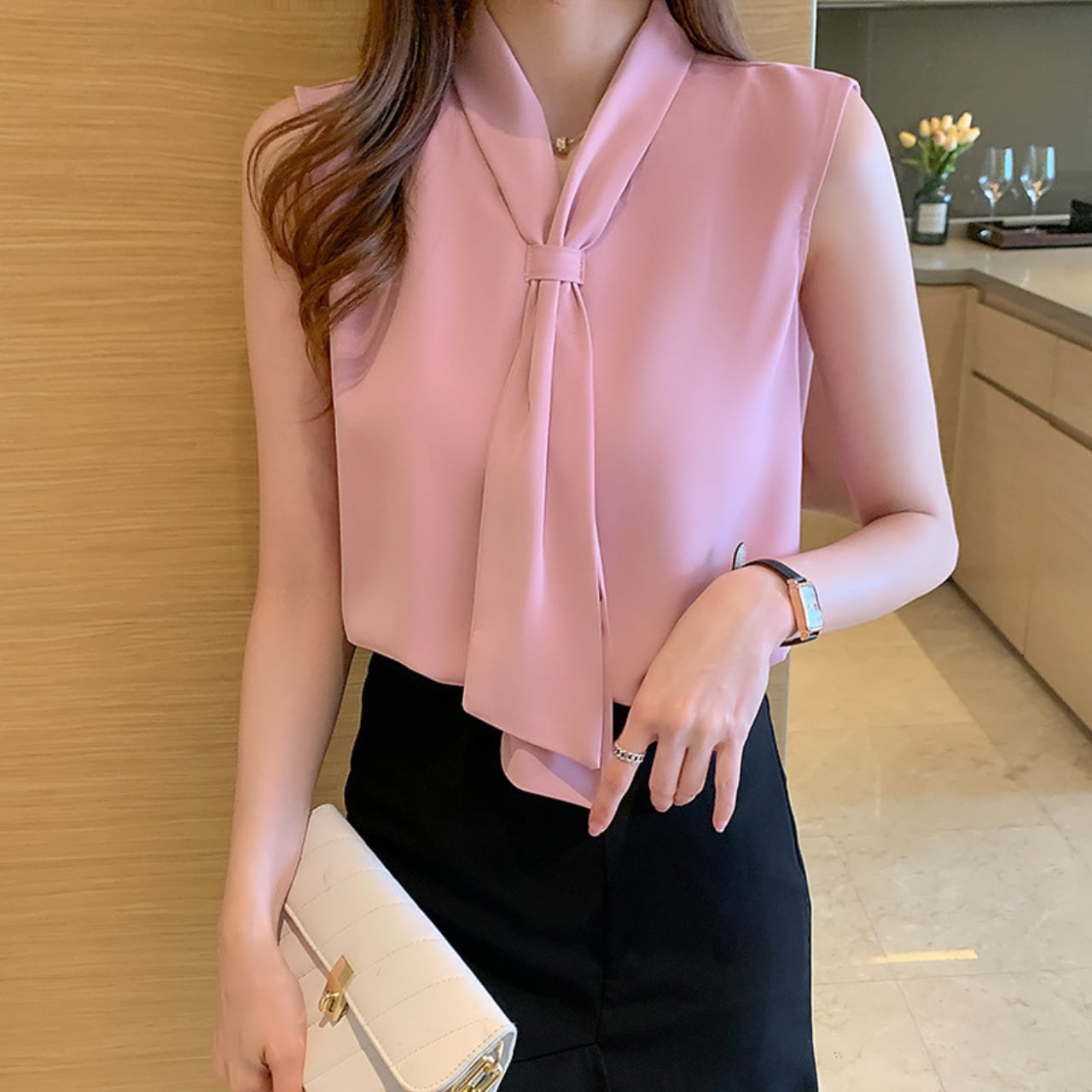 フェミニンな胸元のタイがアクセント 。