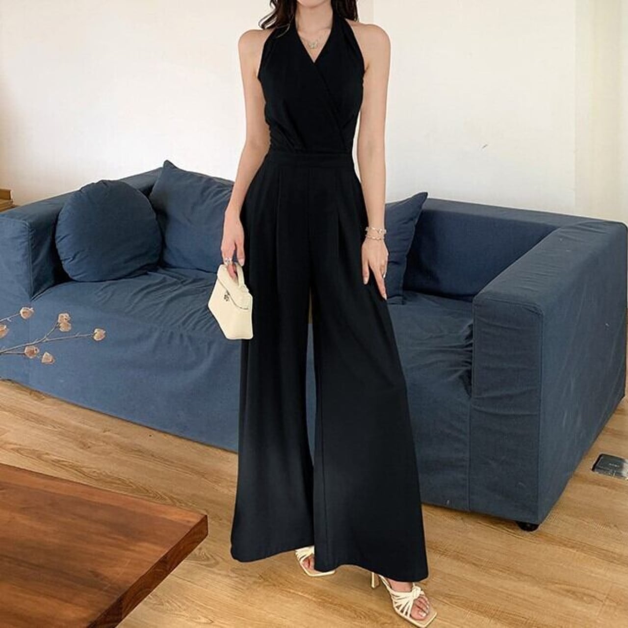 着用するだけで大人可愛い雰囲気が漂うホルターネックエレガントバックリボンワイドレッグジャンプスーツ。