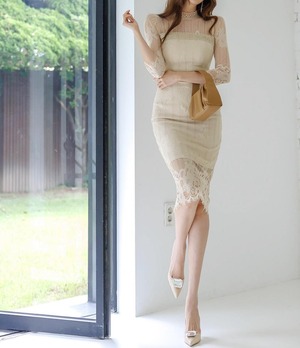 着用するだけでフェミニンな雰囲気が漂うスタンドカラーエレガントスリークオータースリーブレースドレス。