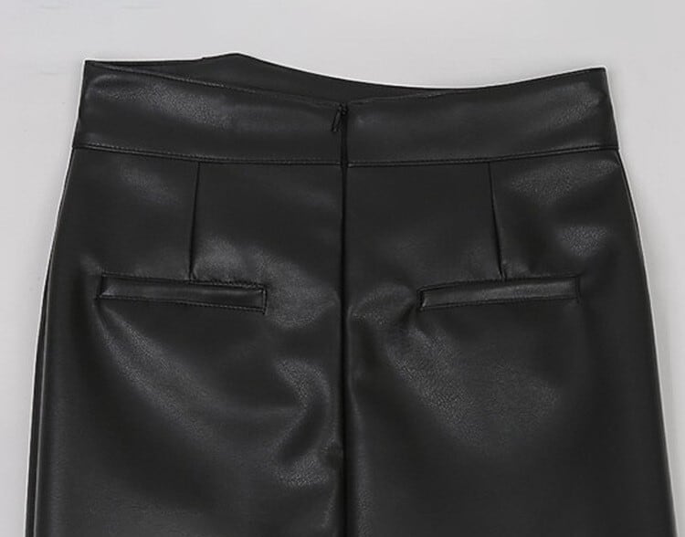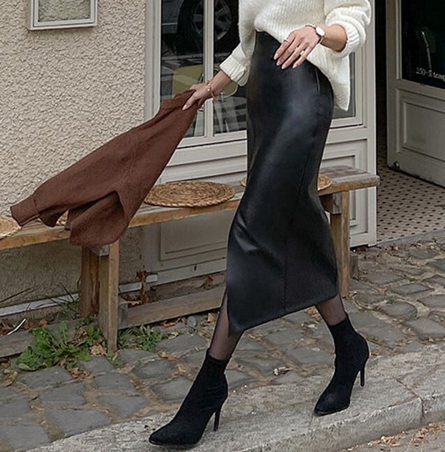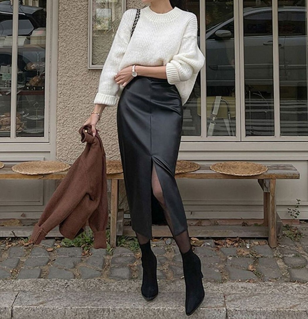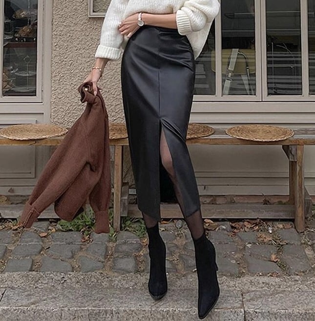 High waist elegant front slit slim leather skirt