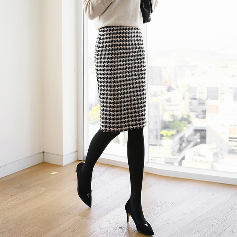 着用するだけで上品でエレガントな雰囲気が漂うハイウエストエレガント千鳥格子ヒップカバーウールスカート。