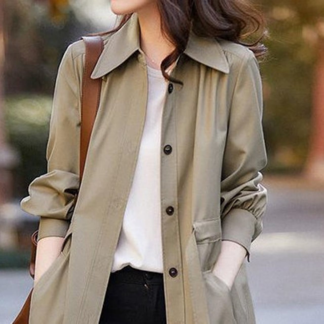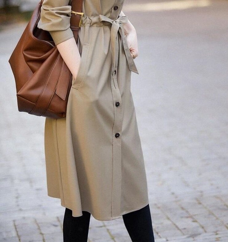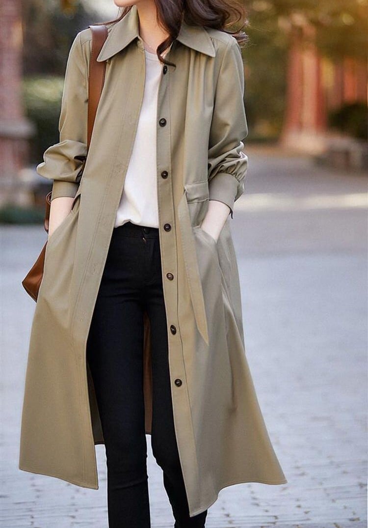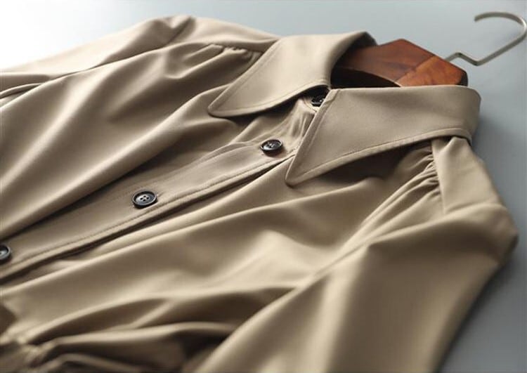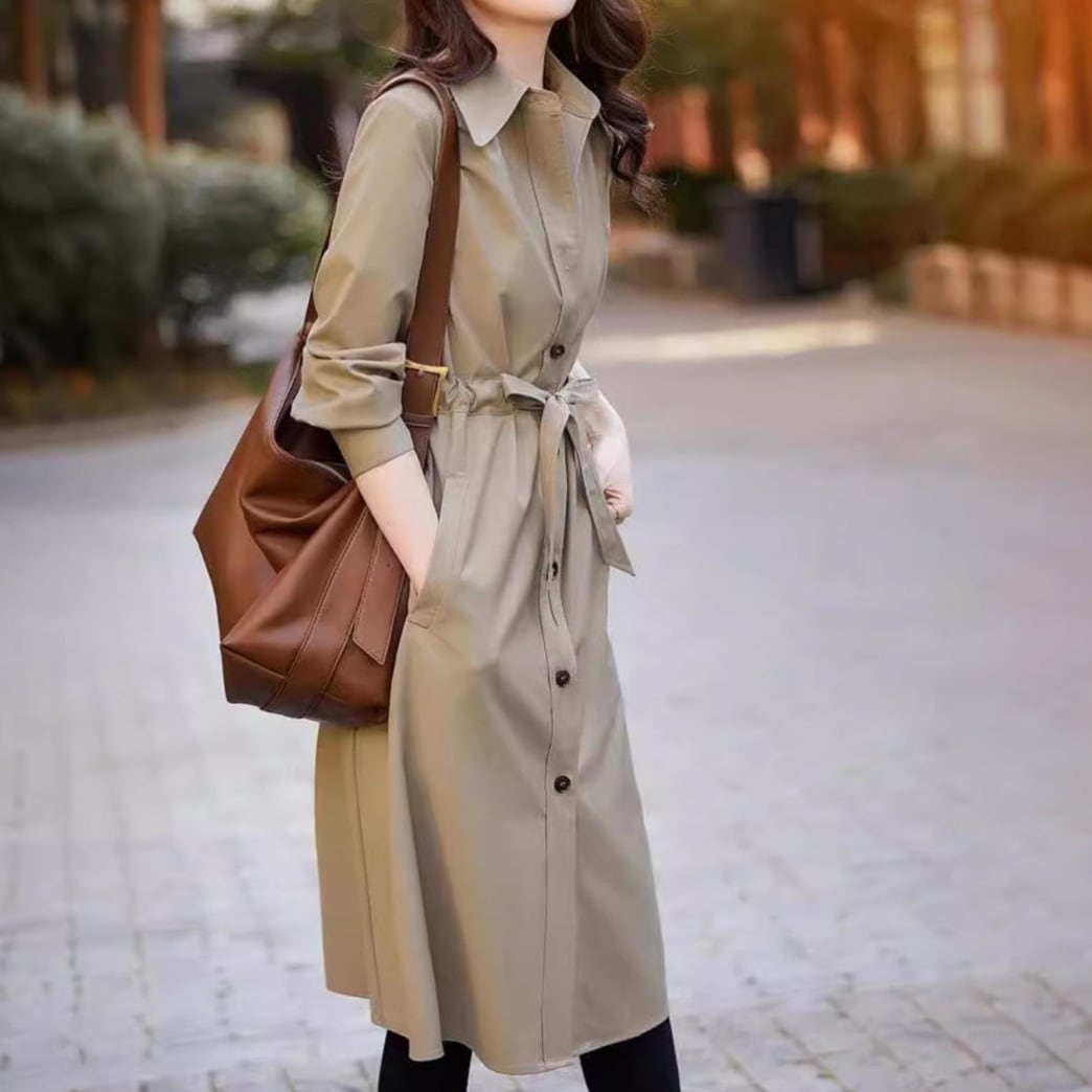 羽織るだけでフェミニンな雰囲気が漂うポロカラーエレガントストラップミドルトレンチコート。