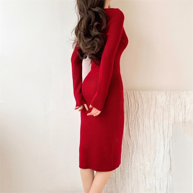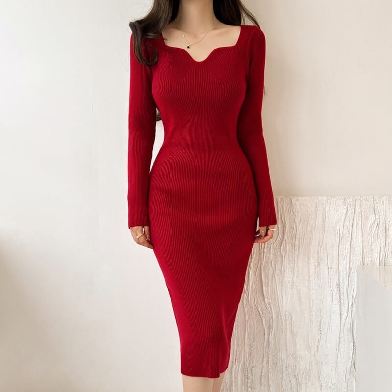 Square collar elegant slim fit middle knit dress