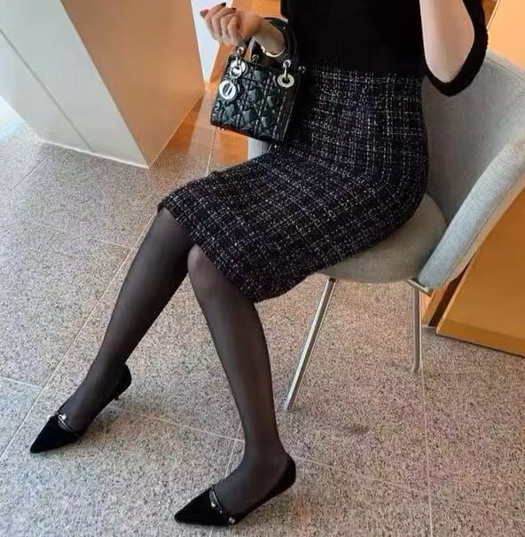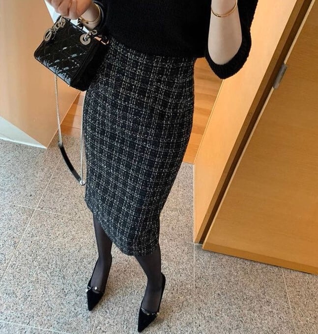 着用するだけでフェミニンな雰囲気が漂うハイウエストエレガントレトロチェックツイードスカート 。