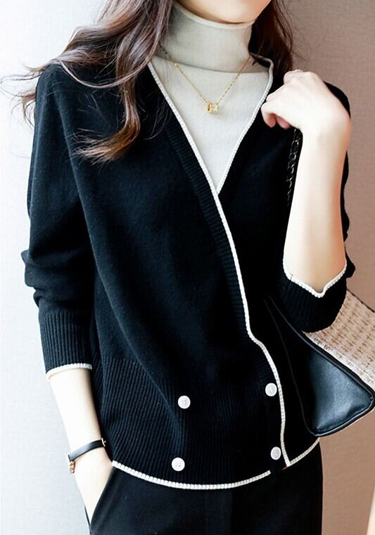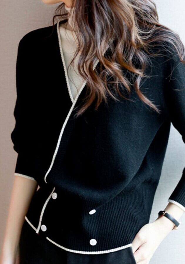 着用するだけで大人可愛い雰囲気が漂うハイカラーエレガントダブルブレストニット。