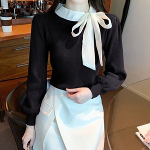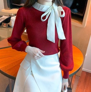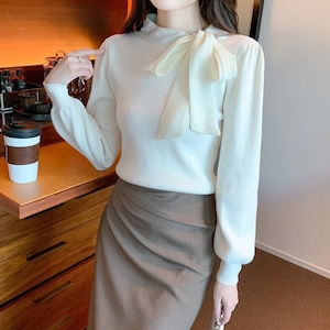 着用するだけで大人可愛い雰囲気が漂うチェストリボンエレガントスリムフィットニット。