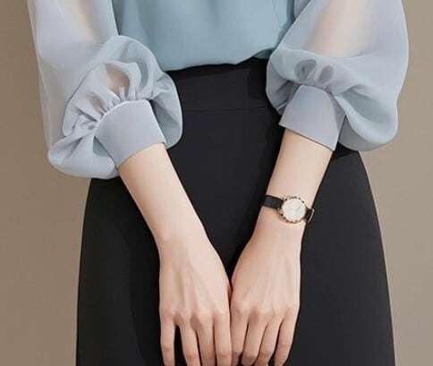 着用するだけで上品さと大人可愛さが漂うラウンドネックエレガント七分袖シフォンシャツ。