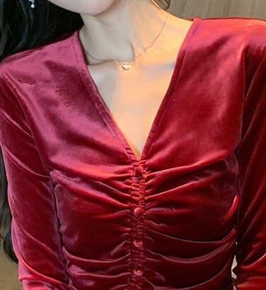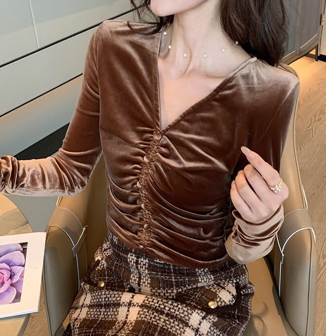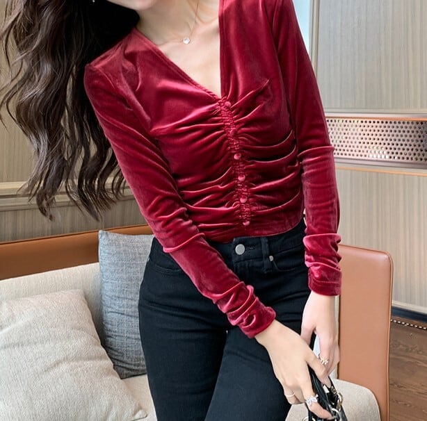 着用するだけで大人可愛い雰囲気が漂うVネックエレガントスリムフィットベルベットシャツ。