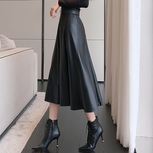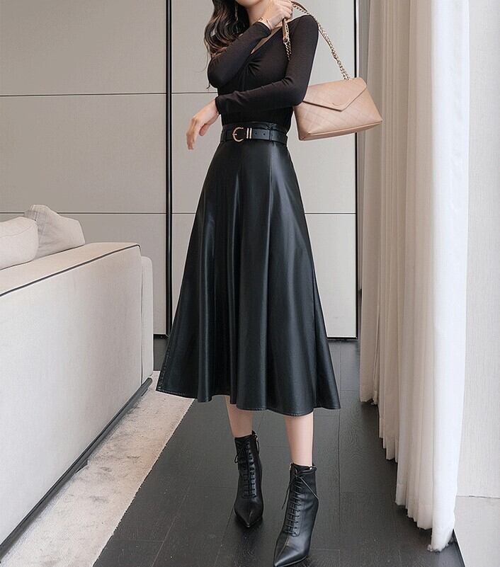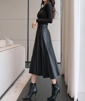着用するだけで大人可愛い雰囲気が漂うハイウエストエレガントベルベットレザースイングスカート 。