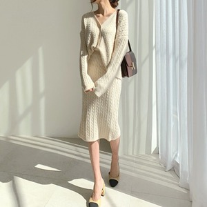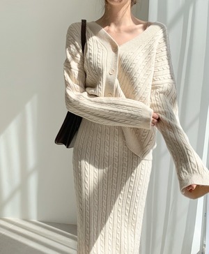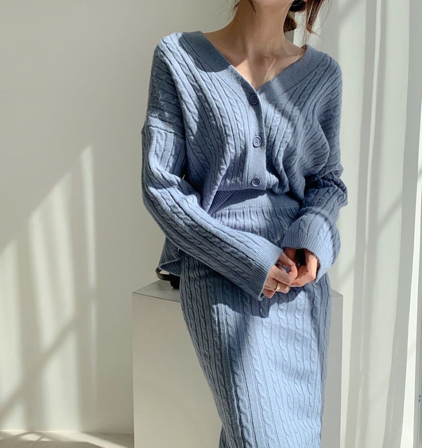 シングルブレストニットカーディガンとヒップカバーニットスカートのセット商品です。