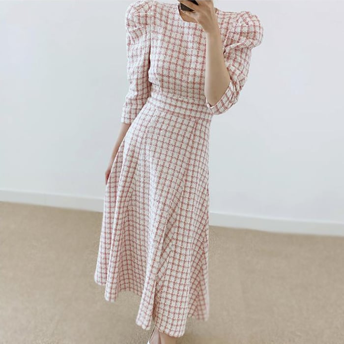 着用するだけでフェミニンな雰囲気が漂うの七分袖エレガントツイードチェックスイングドレス 。