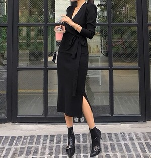 V neck elegant lace up slim knit dress set up ( 2color )