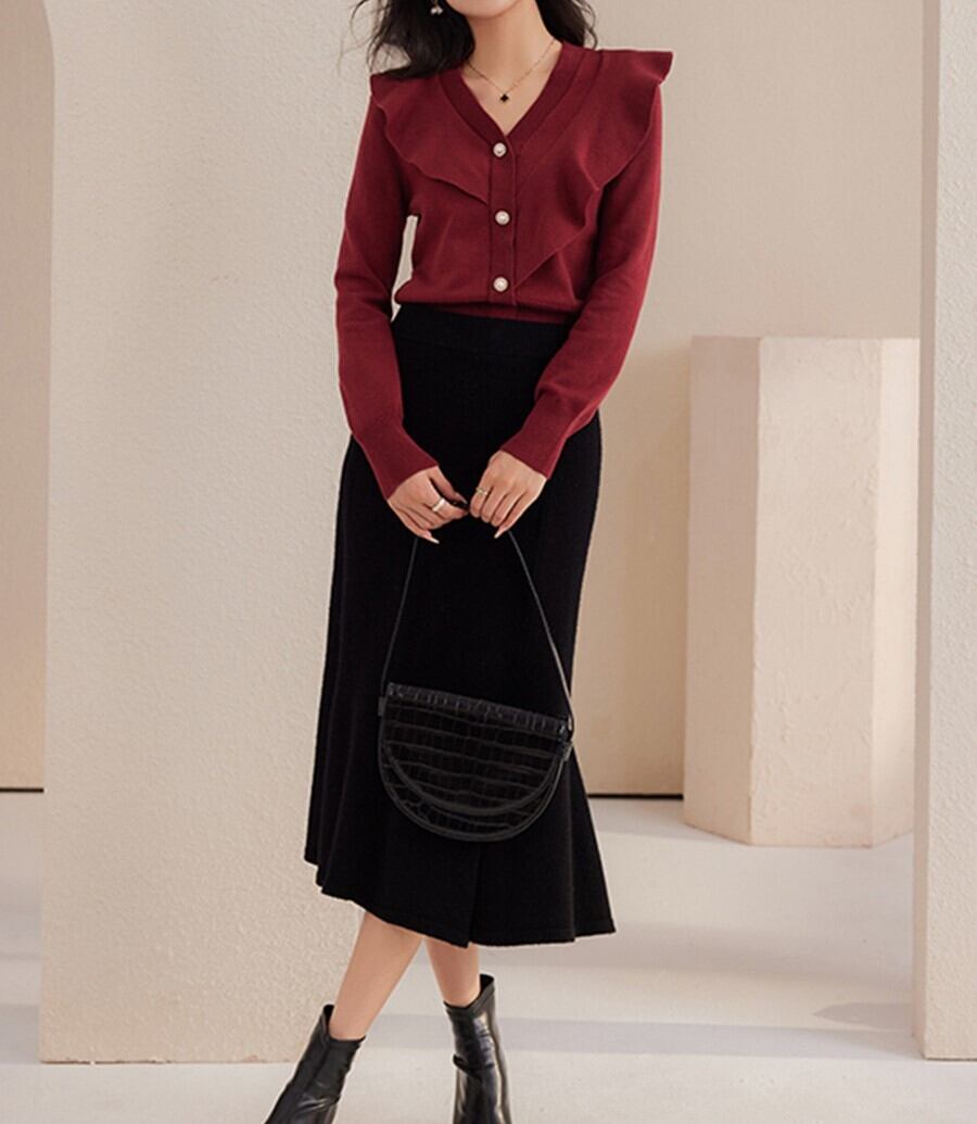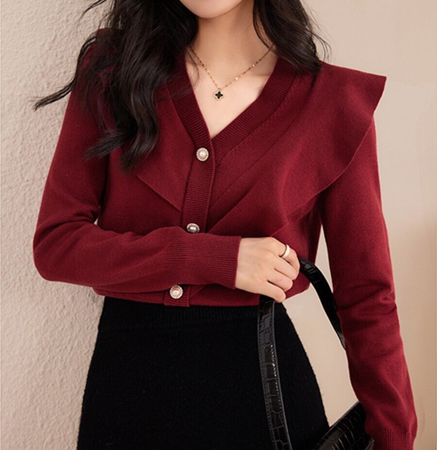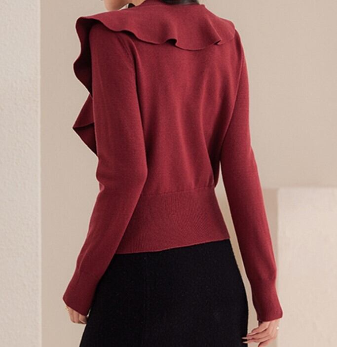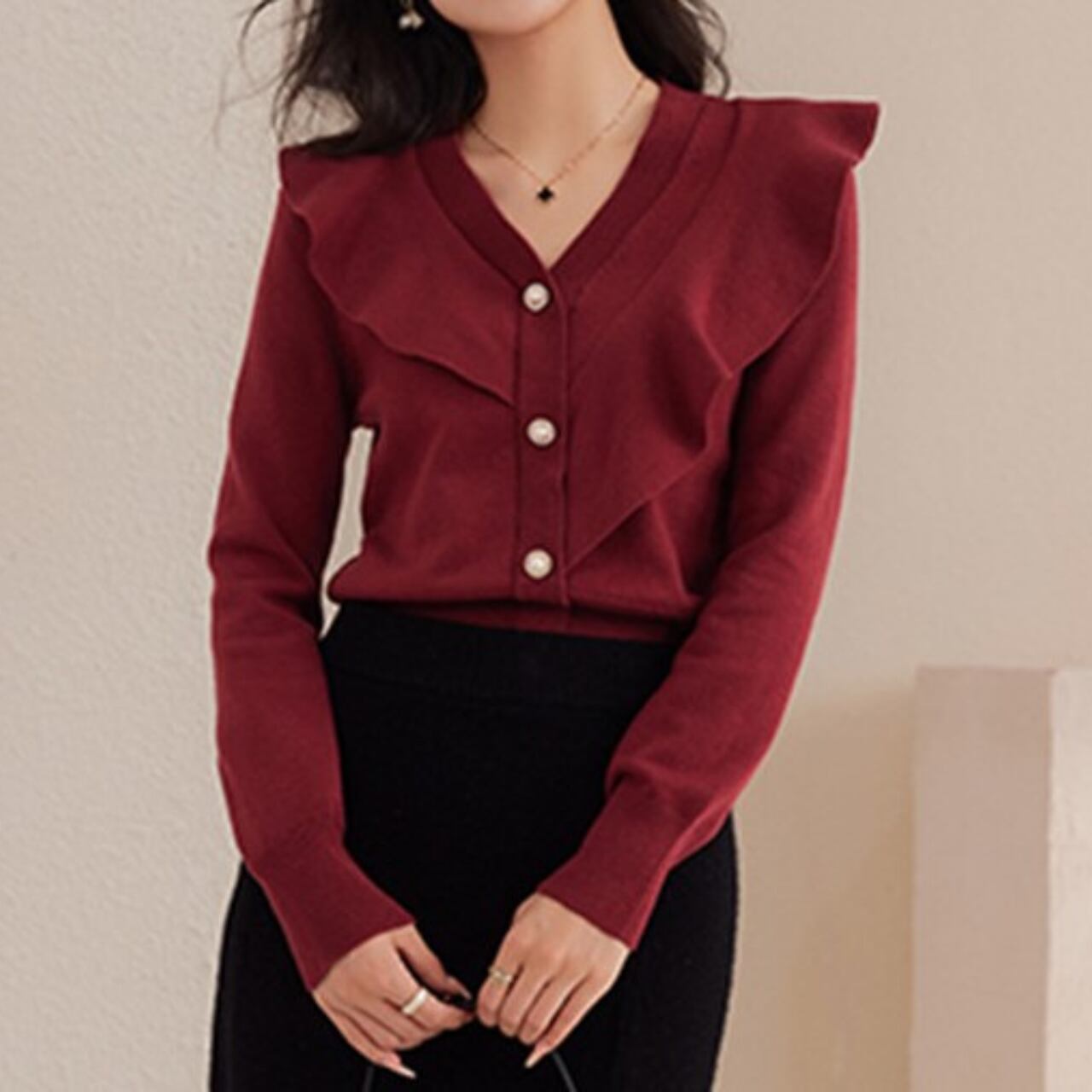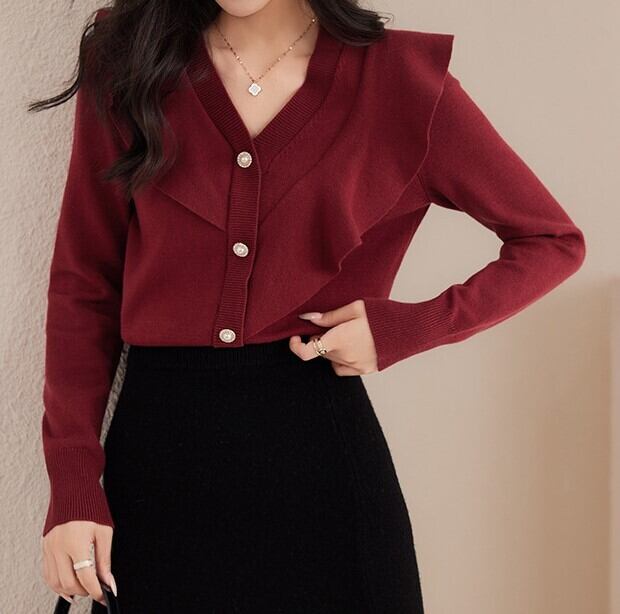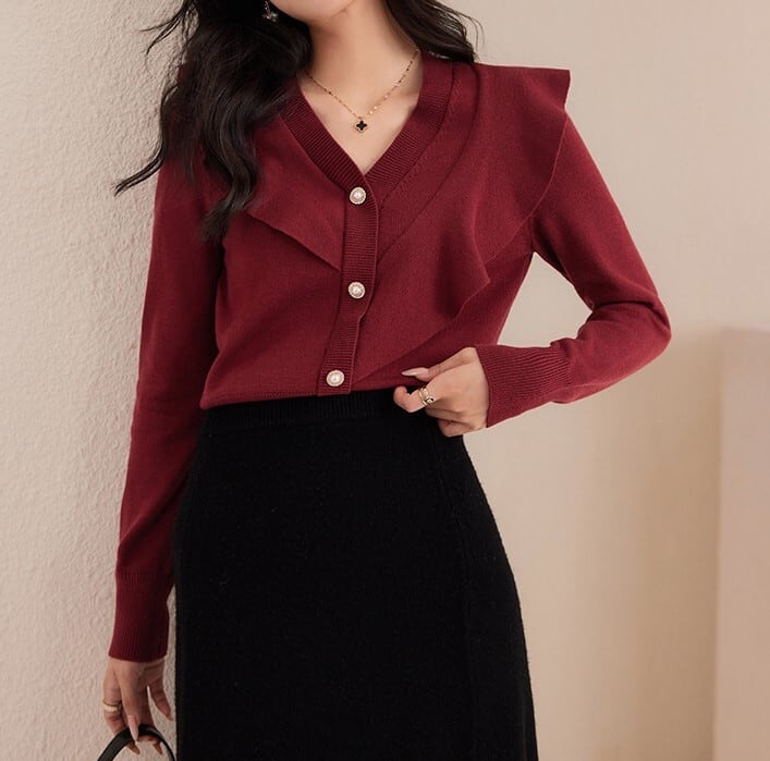 一枚で華やぎを添えるデザインのVネックエレガントラッフルステッチニットカーディガン。