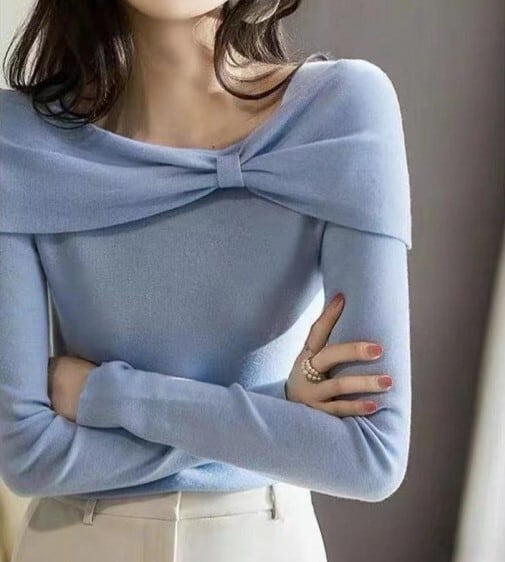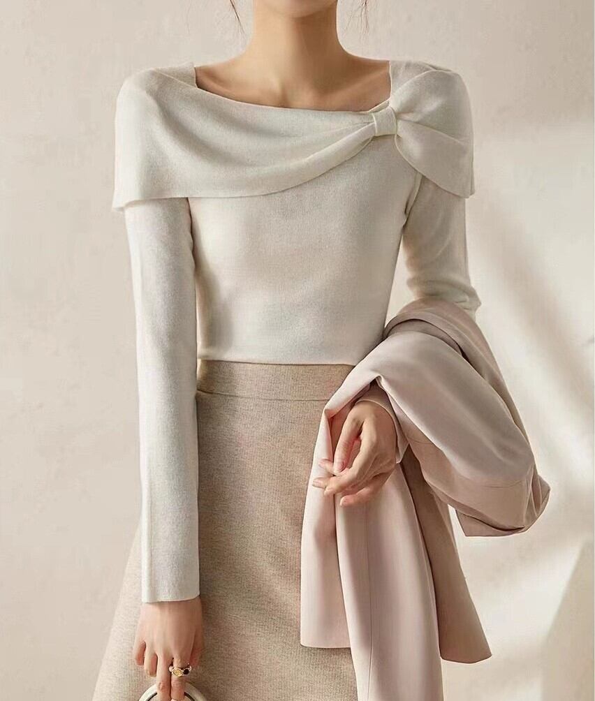 着用するだけで大人可愛い雰囲気が漂うチェストショールエレガントスリムフィットニット。