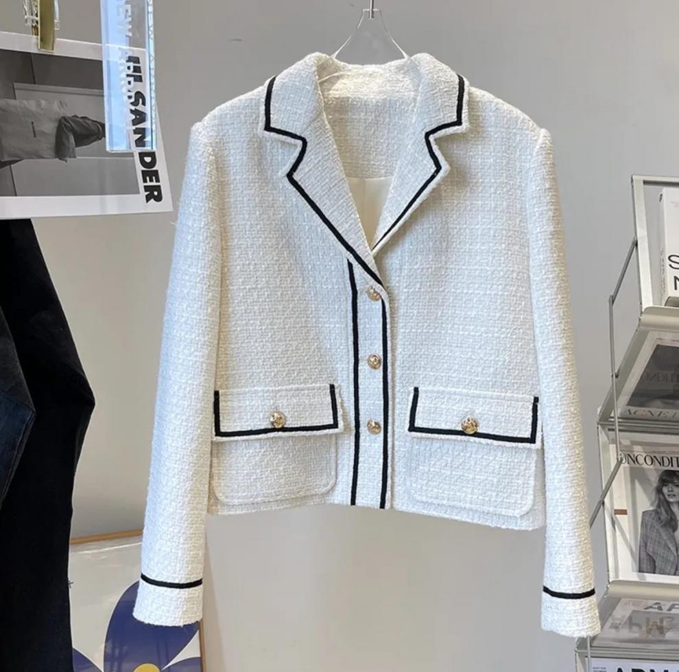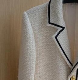 羽織るだけでフェミニンな雰囲気が漂うスーツカラーエレガントショートツイードジャケット。