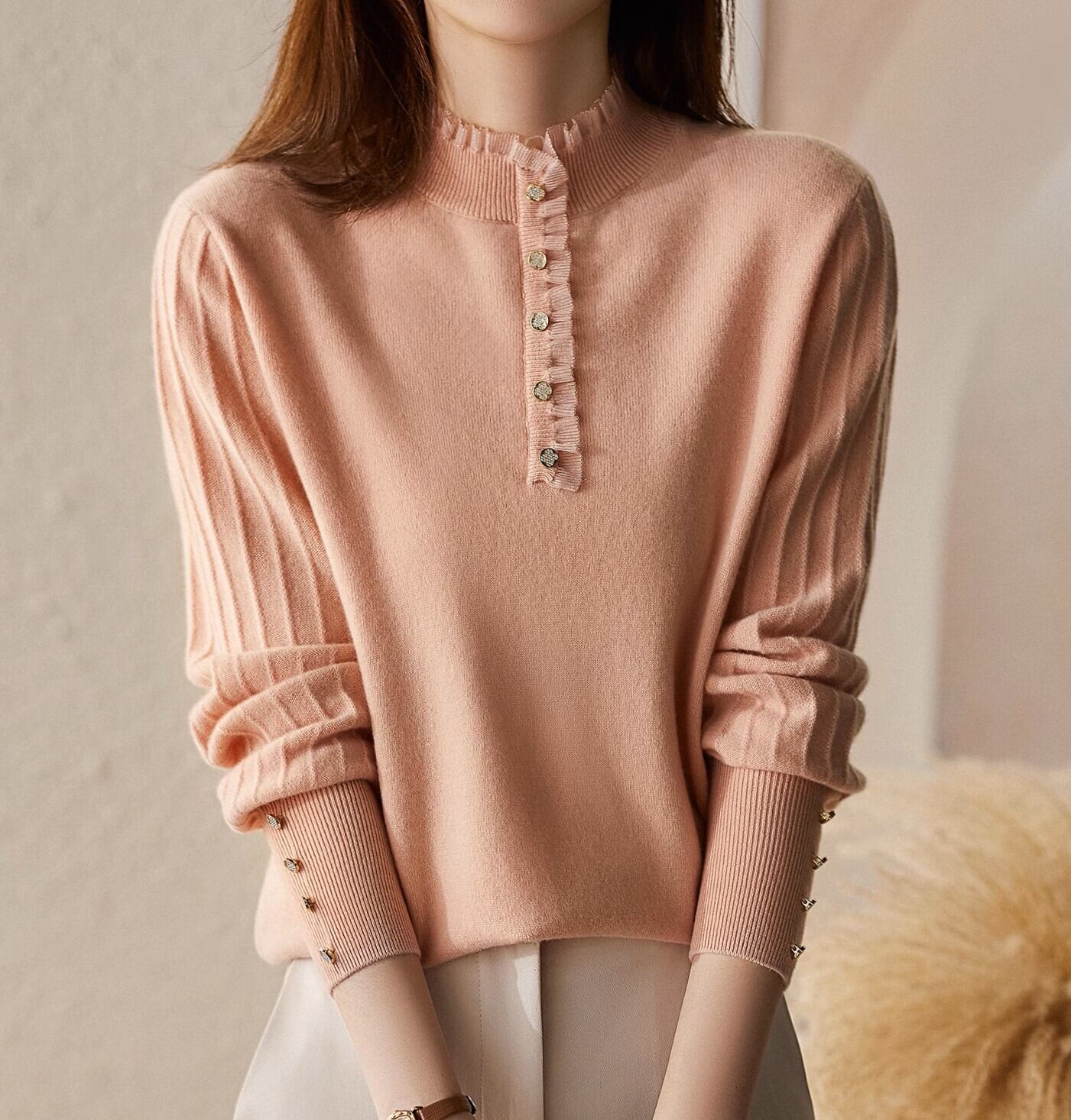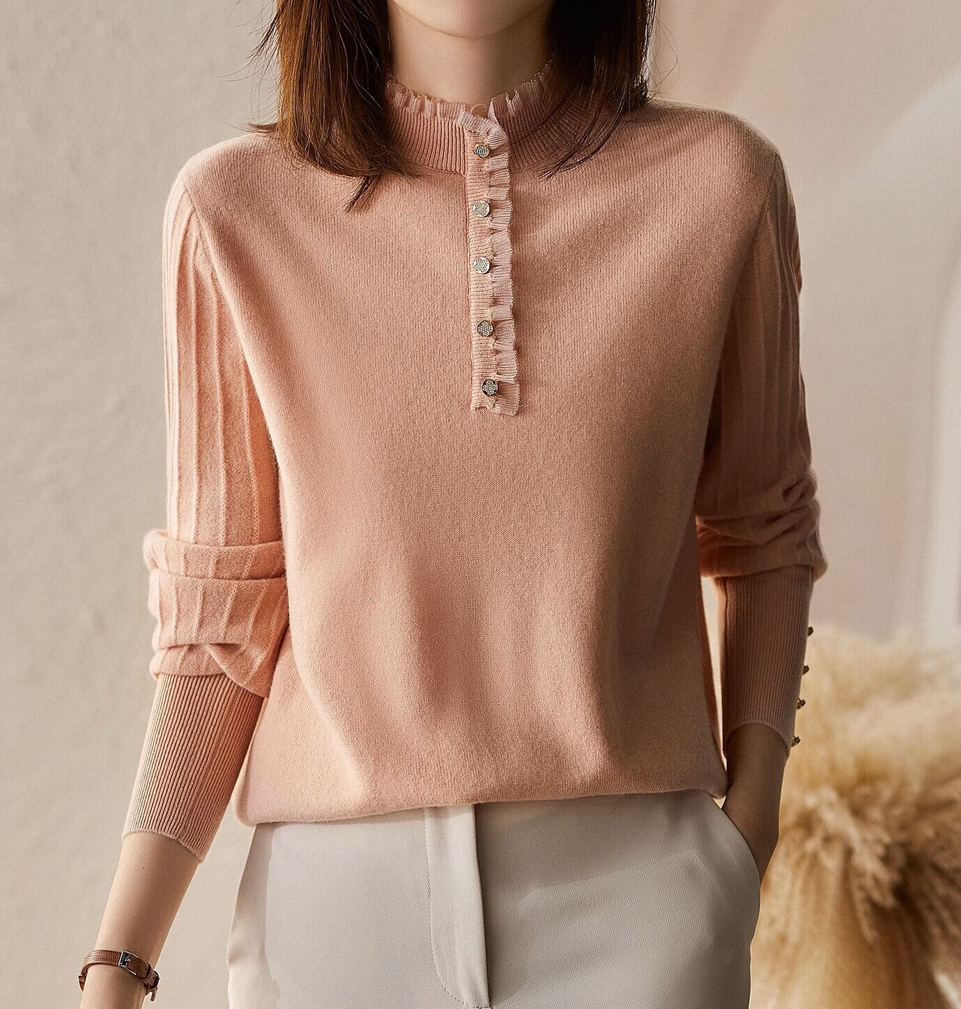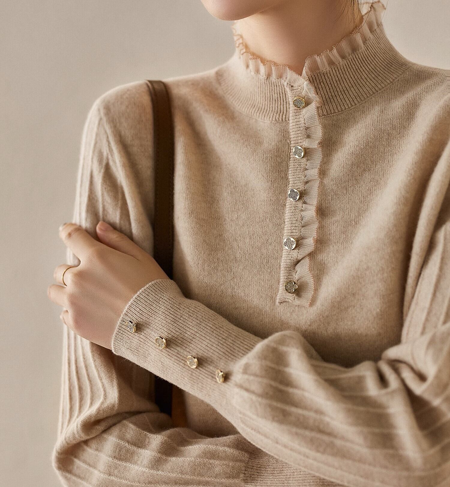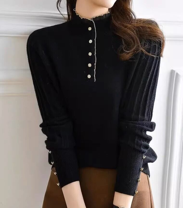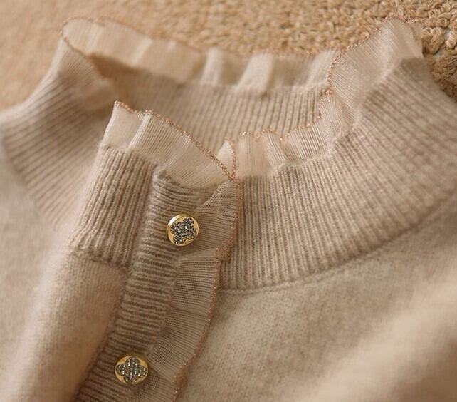 着用するだけで大人可愛い雰囲気が漂うハーフハイネックエレガントメッシュステッチスリムニット。
