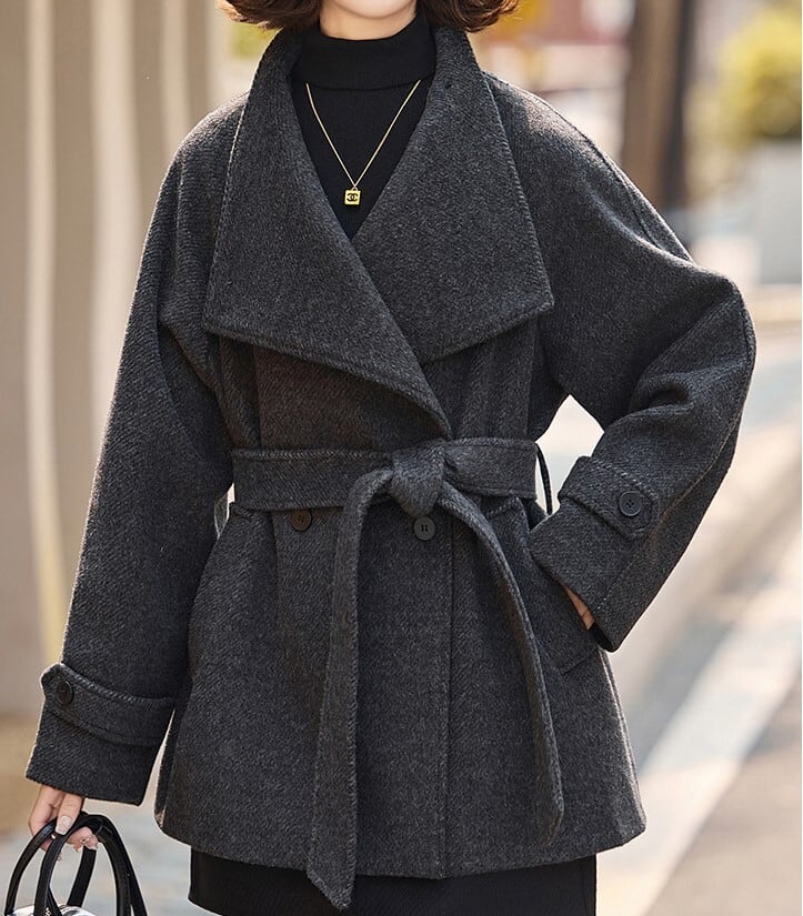 羽織るだけで上品でフェミニンな雰囲気が漂うスタンドカラーエレガントストラップショートコート。