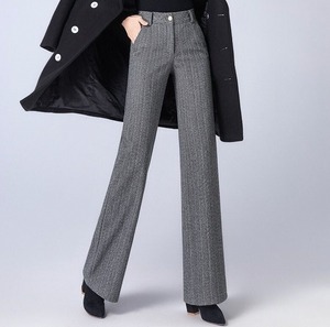 着用するだけでフェミニンな雰囲気が漂うハイウエストエレガントヘリンボーンウールワイドレッグパンツ。