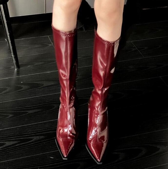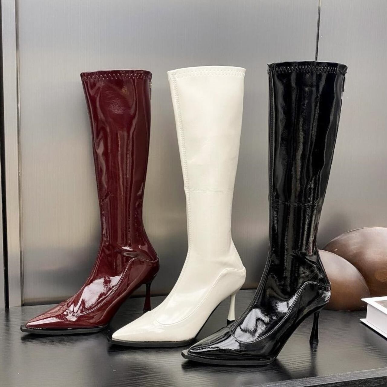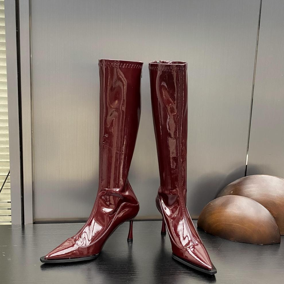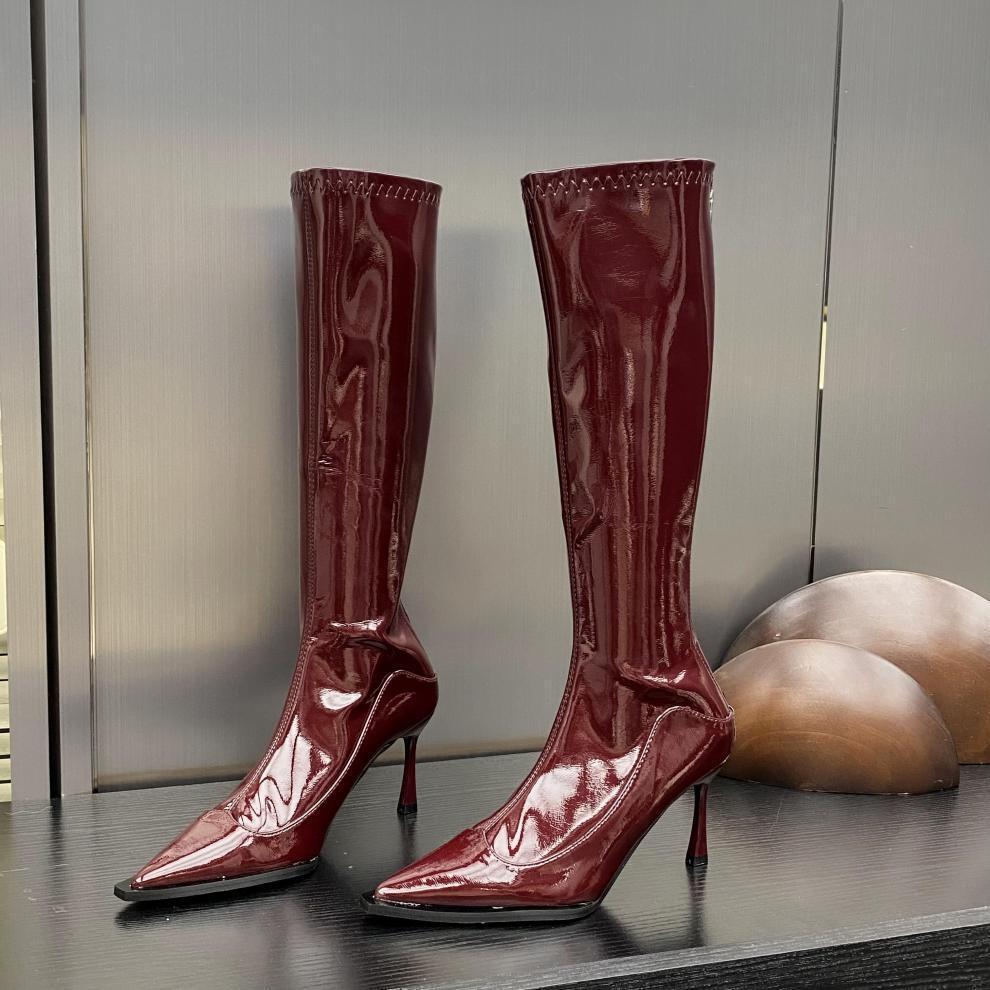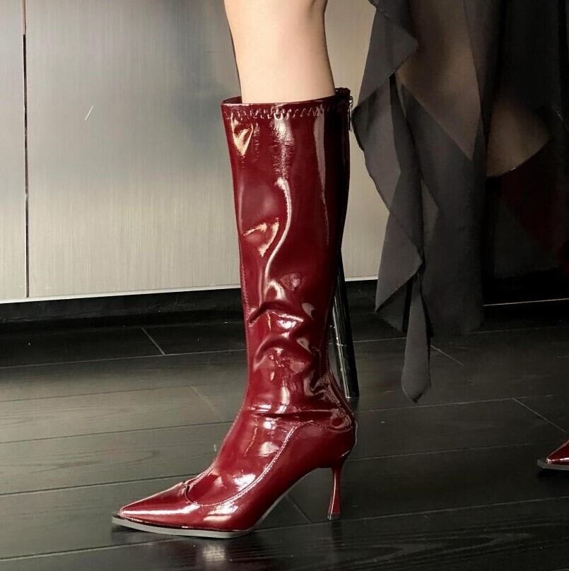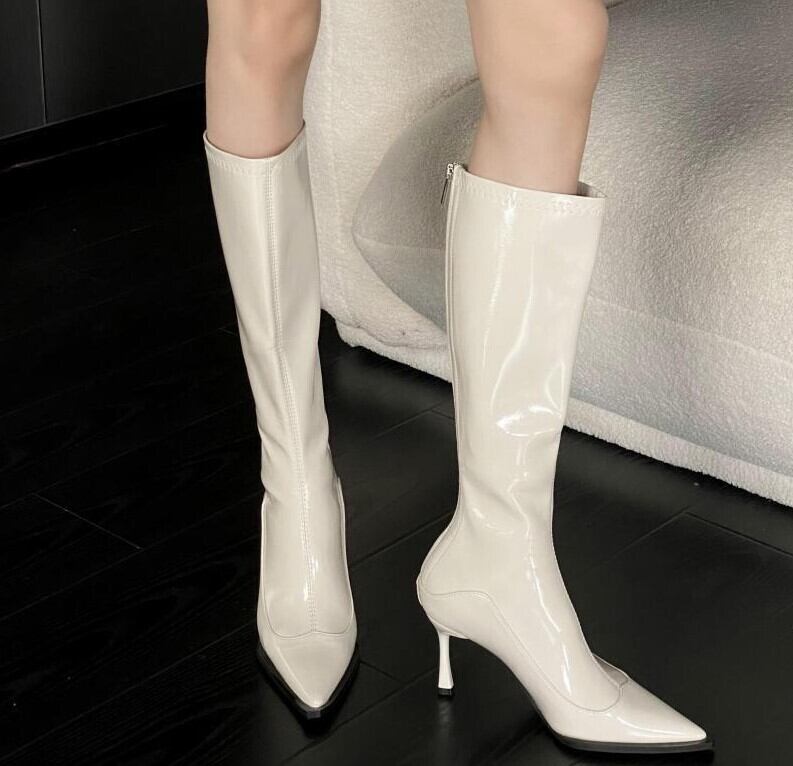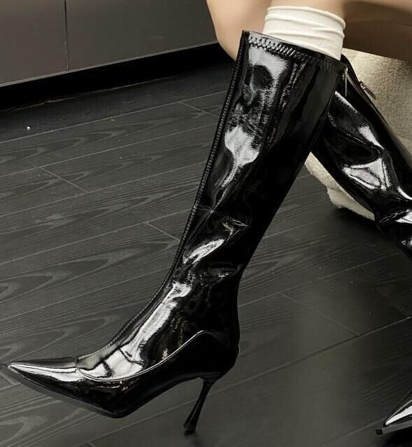 足元をフェミニンに演出するエレガントピックアップレザーシャイニーロングブーツ。