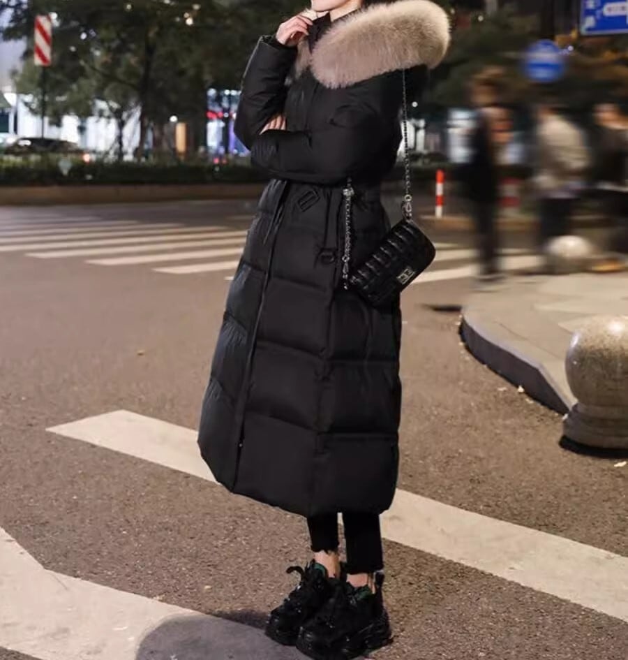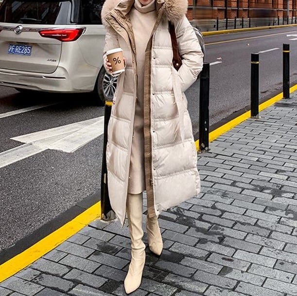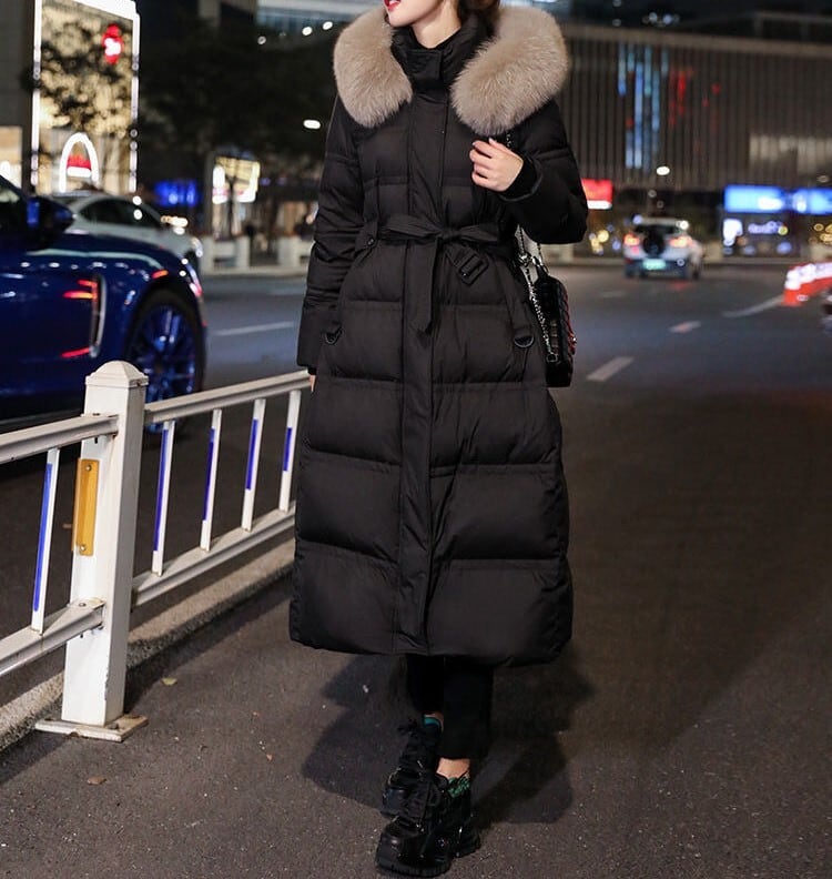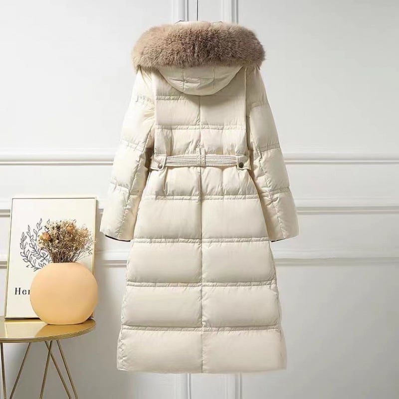 羽織るだけで上品でフェミニンな雰囲気が漂うファーカラーエレガントストラップロングダウンコート。