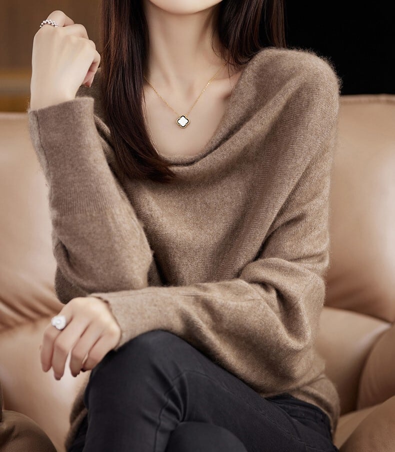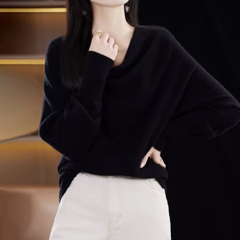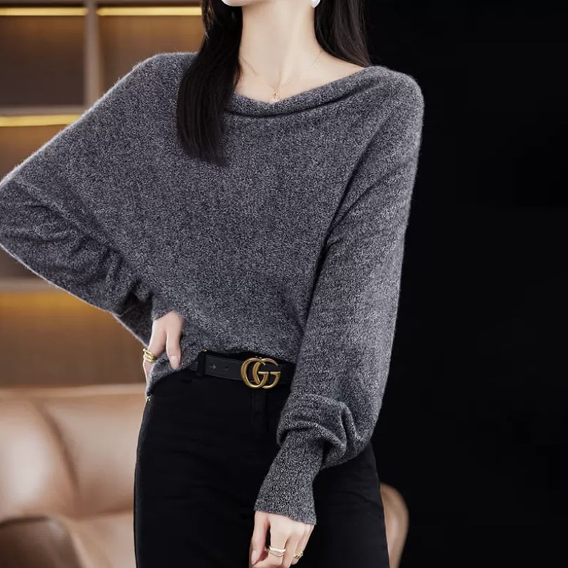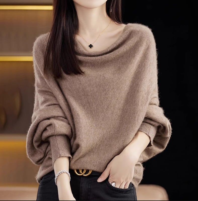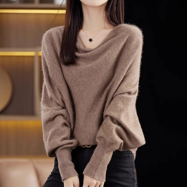 着用するだけでフェミニンな雰囲気が漂うスイングカラーエレガントドルマンスリーブニット 。