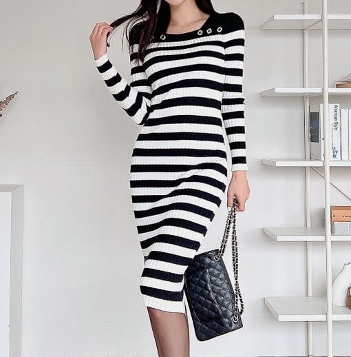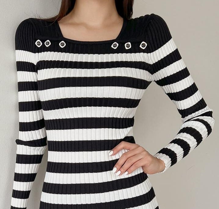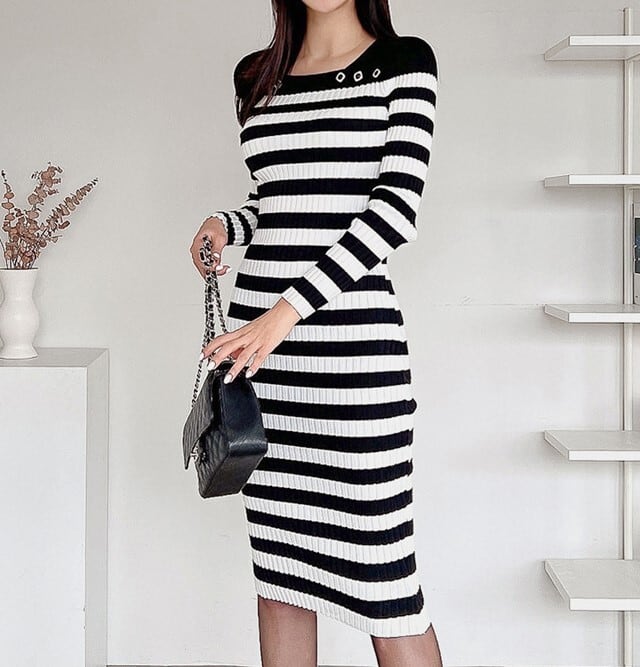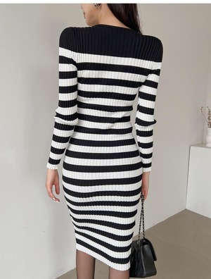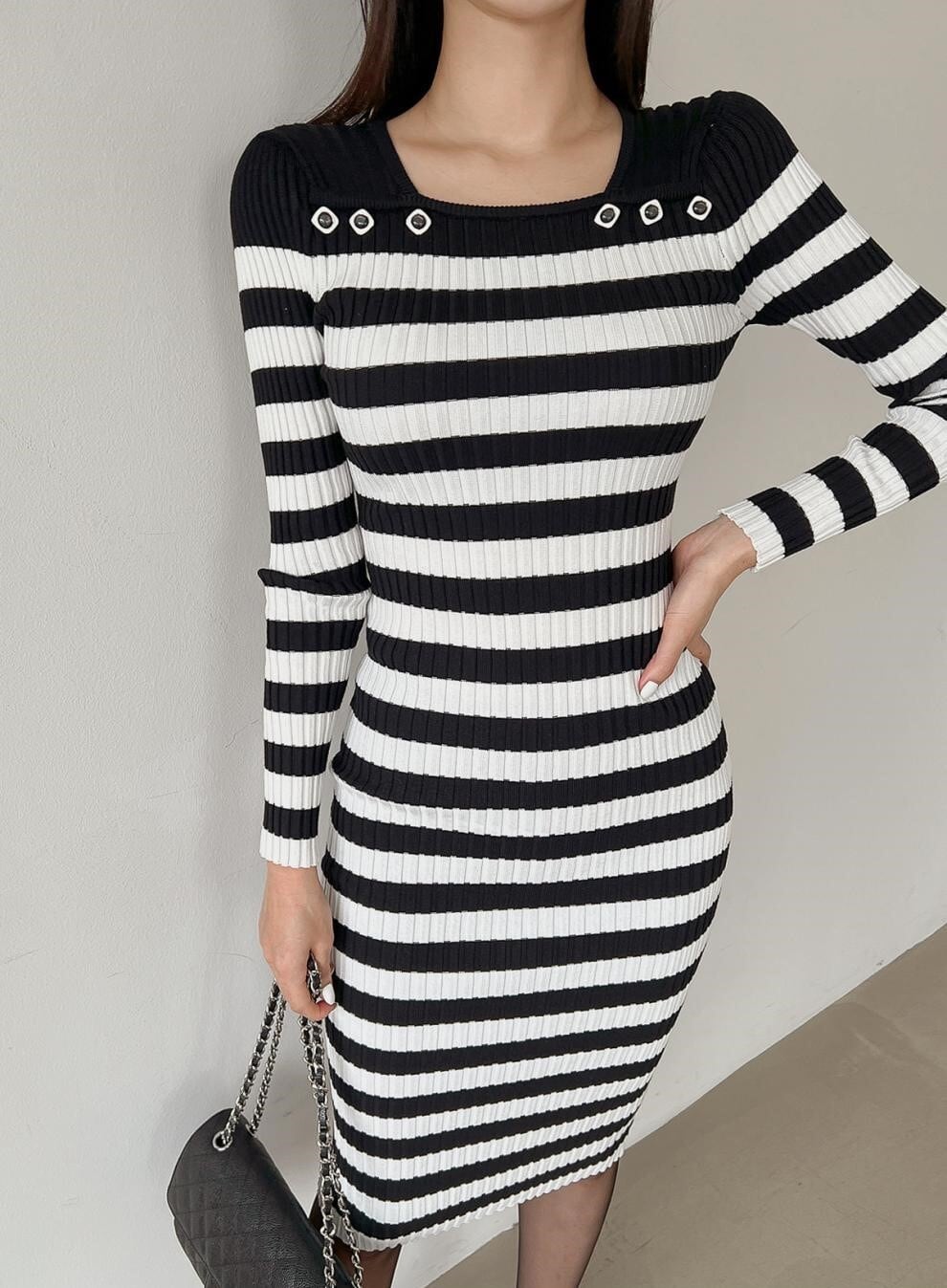 着用するだけでフェミニンな雰囲気が漂うスクエアカラーエレガントストライプスリムニットドレス。