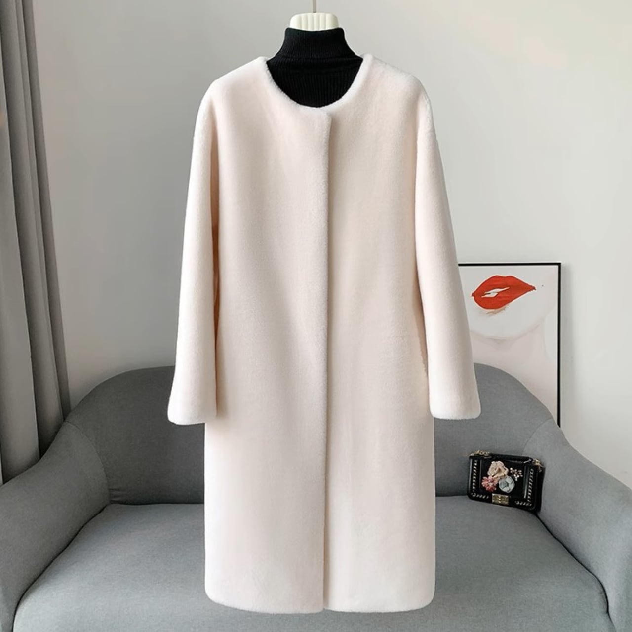 Collarless elegant fluffy velvet long coat ( 2color )