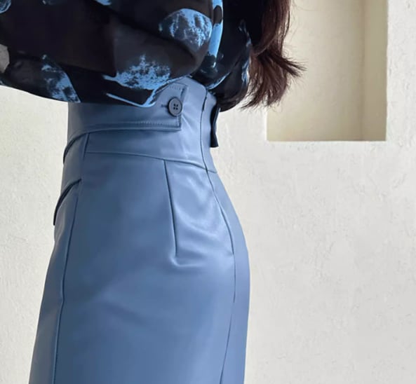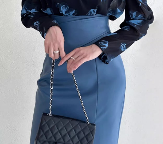 着用するだけでフェミニンな雰囲気が漂うハイウエストエレガントクロスステッチミドルレザースカート。
