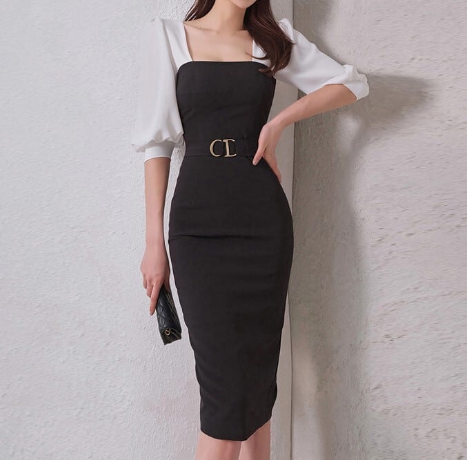 Square collar elegant hip cover slim dress ( 2color )
