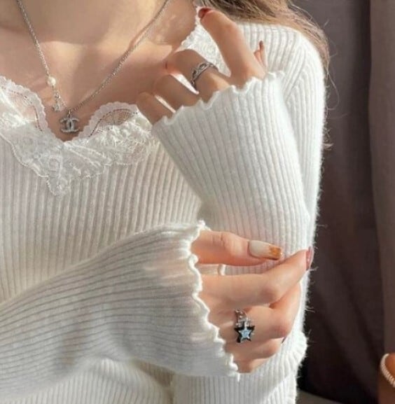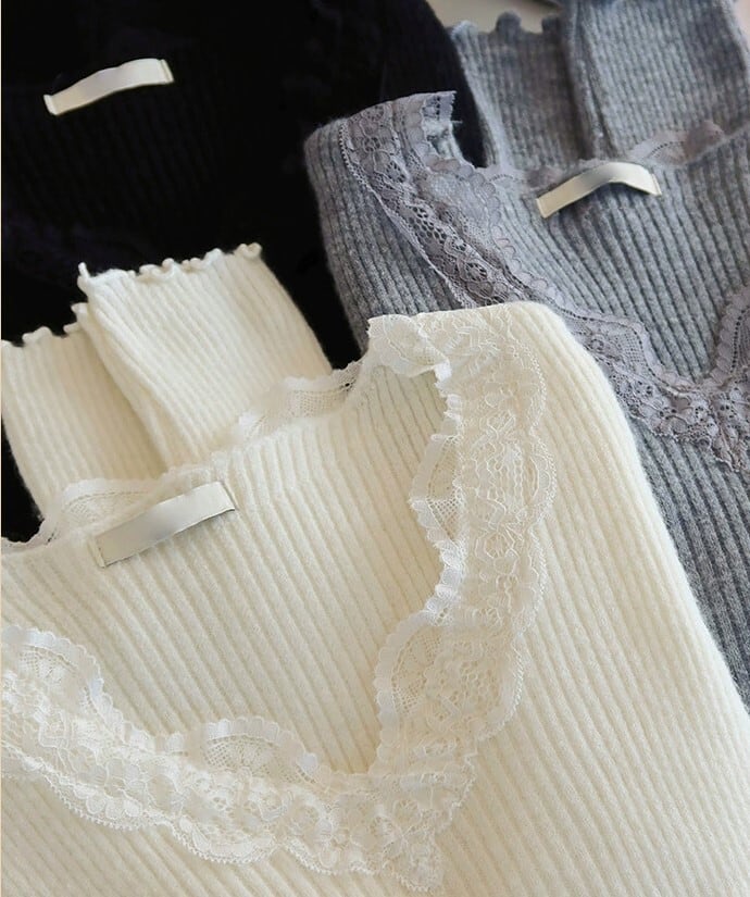 着用するだけでフェミニンな雰囲気が漂レースステッチエレガントフレアスリーブニット 。