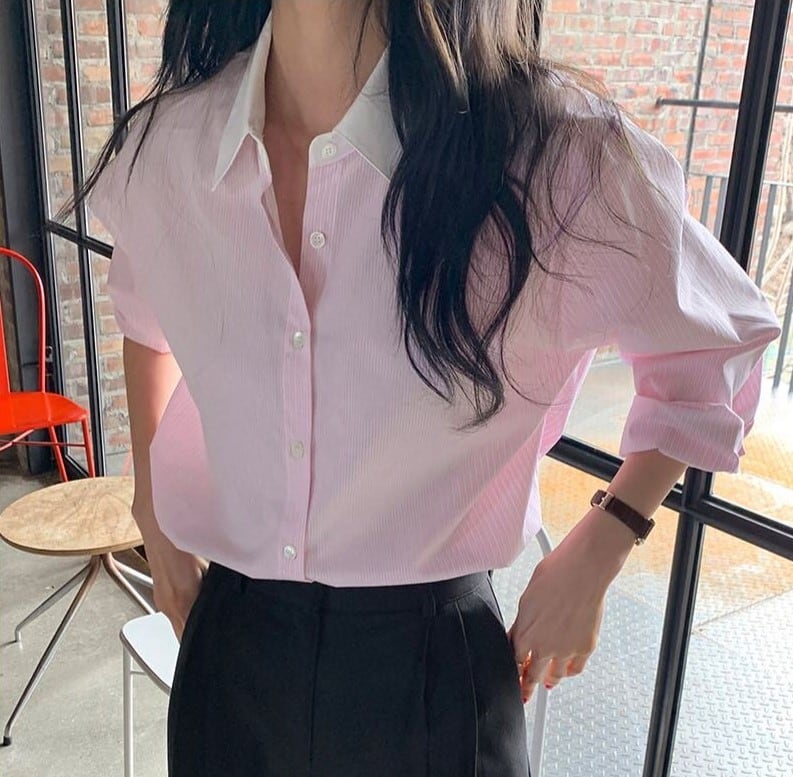 着用するだけで上品で大人可愛い雰囲気が漂うラペルカラーエレガントストライプブラウス。
