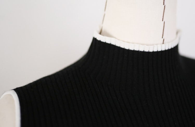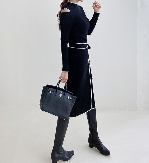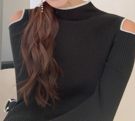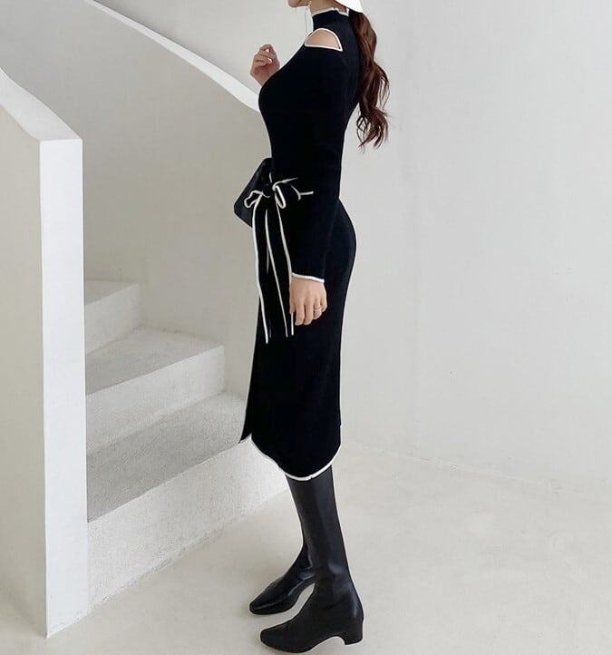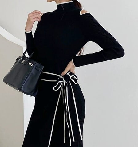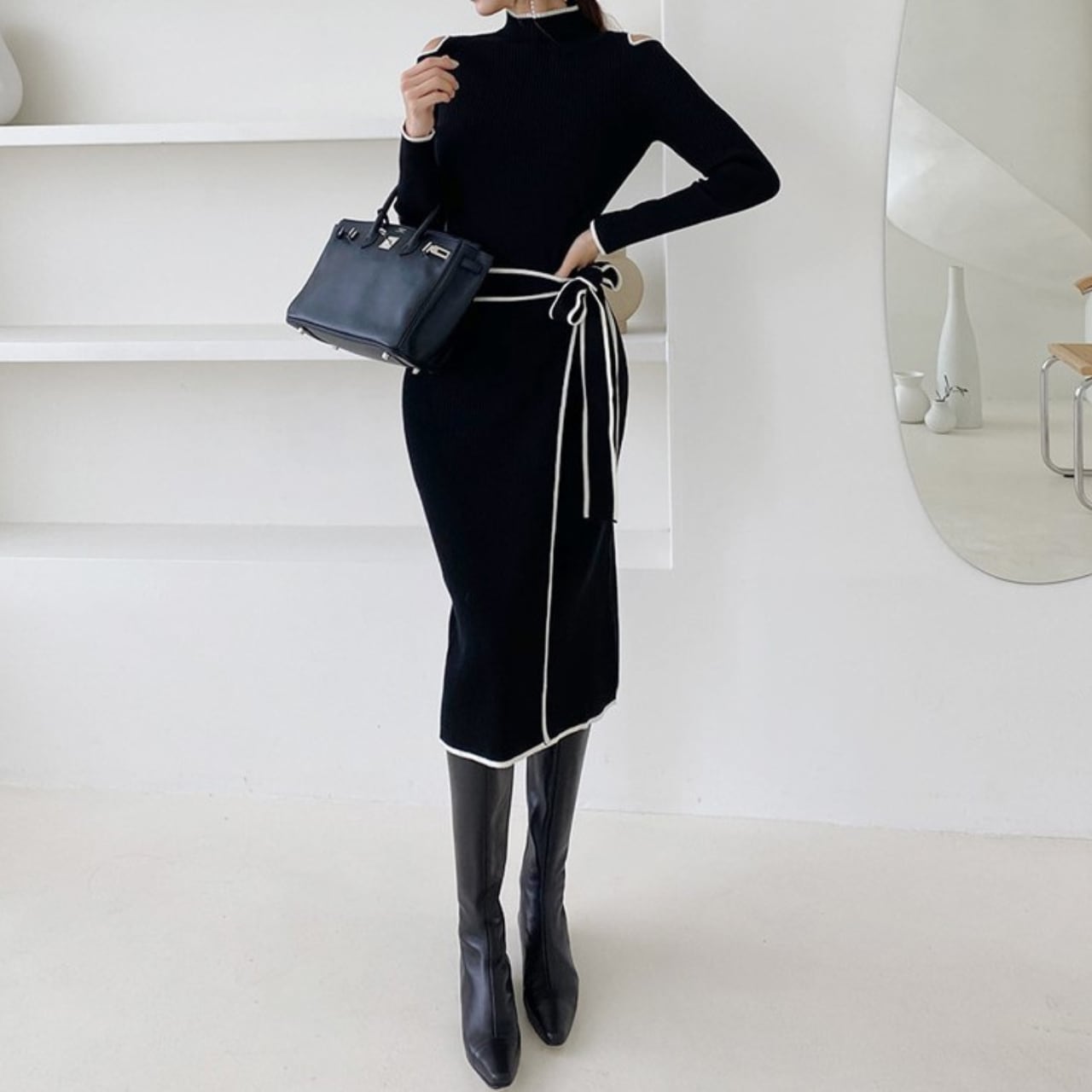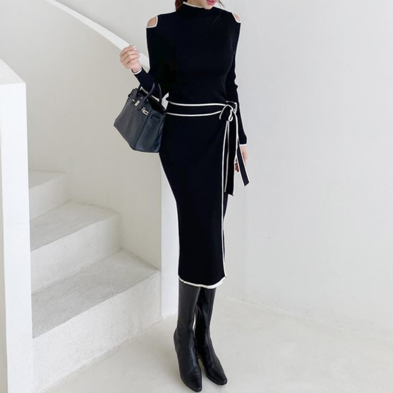 着用するだけでフェミニンな雰囲気が漂うハーフハイネックエレガントオフショルダーレースアップニットドレス。