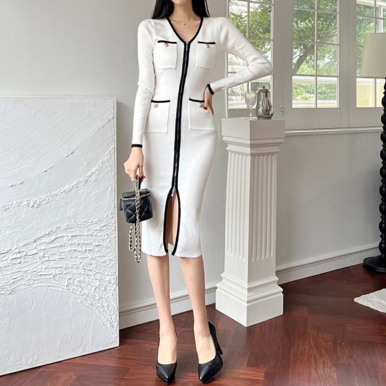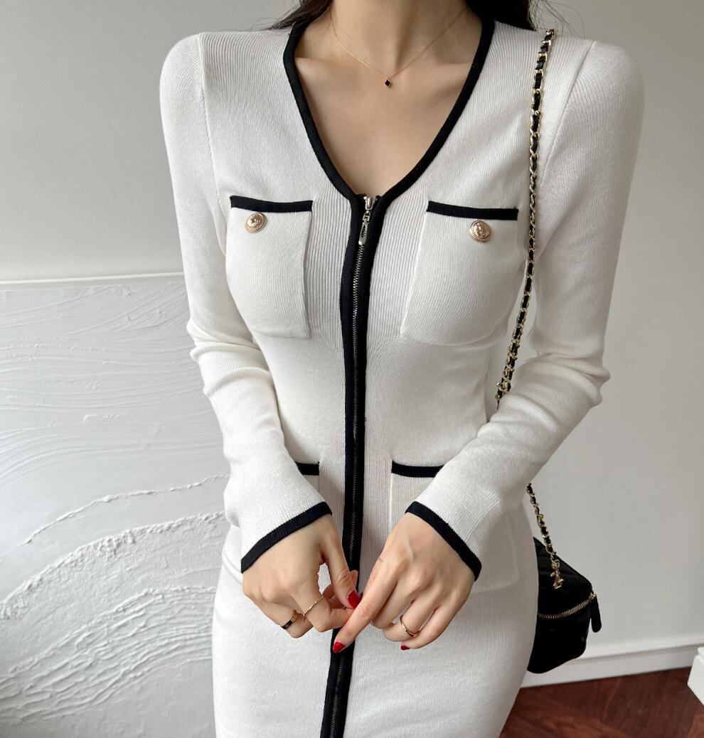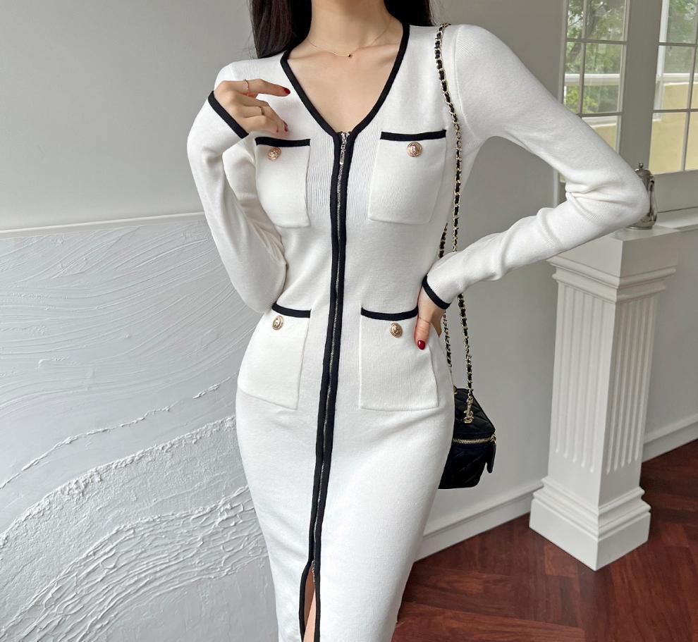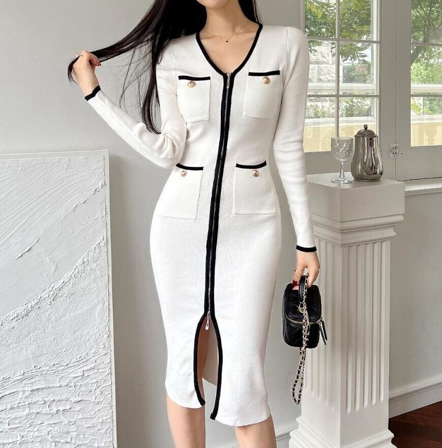 着用するだけでフェミニンな雰囲気が漂うVネックエレガントフロントジップヒップカバーニットドレス。